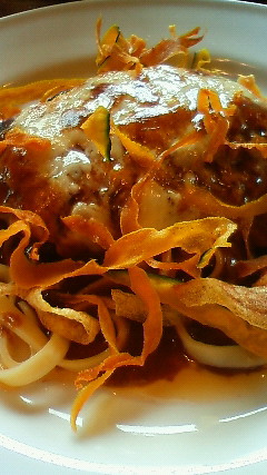 で、画像ですが、地元のお風呂やさんのお向かいにある洋食やのハンバーグランチですが、チーズののったハンバーグの上に、薄くスライスしたカボチャのフライがちりばめられていて、彩りが綺麗なので撮りました。