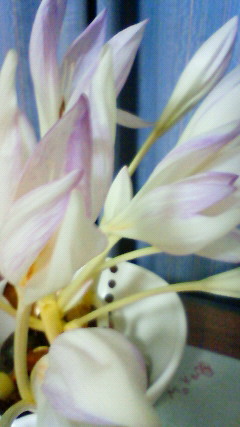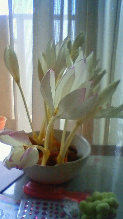 コルチカムが咲きました。 全部白ですが、花びらの縁が薄紫です。 あまり大きく開かず控え目な感じですね。 買った時は半信半疑でしたが、 こうして見ると驚きです。ずぼらな私にぴったり。 花が終わったら土に植えると聞いたので 畑につれていこうか? それともベランダにしようか?迷う・・・・・・。 ところで、今日は予想より早い時間から 青空が見え始め、雨が上がるのが早かったですね。 なのに、学校は休校で子供たちだけは大喜び 我が家の娘たちは、母が出勤した後からお隣のお嬢さんと遊び始め 丸1日遊び放題 今日の分は後日まとめて勉強していただかないと
