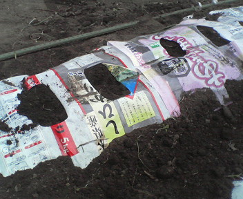 米袋だぁよ\(^o^)/(マルチ) せっせと貯めていた米袋を使ってマルチを作り 「大根」の種を蒔きました。 ノビルや雑草が多い畑なので、少しでも防げて なお且つ土が温かければよく育つかなぁと思いました。 穴の大きさがまちまちなのは、A型?の私の性格です。(汗) 大根もかなりの種類があり迷いましたが、 総太りという種類にしました。 太いという字が気に入ってのです。 太った大根を収穫してみたいものです。
